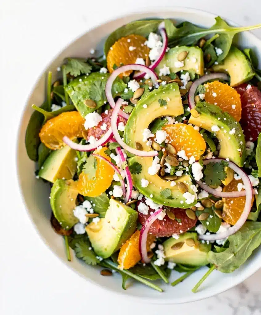 Drizzle the remaining dressing over the top. Scatter the fresh herbs, optional cheese, and toasted pepitas generously over everything. Give the whole Avocado Citrus Salad one very gentle toss at the table, or serve it as is for a gorgeous, layered presentation.
