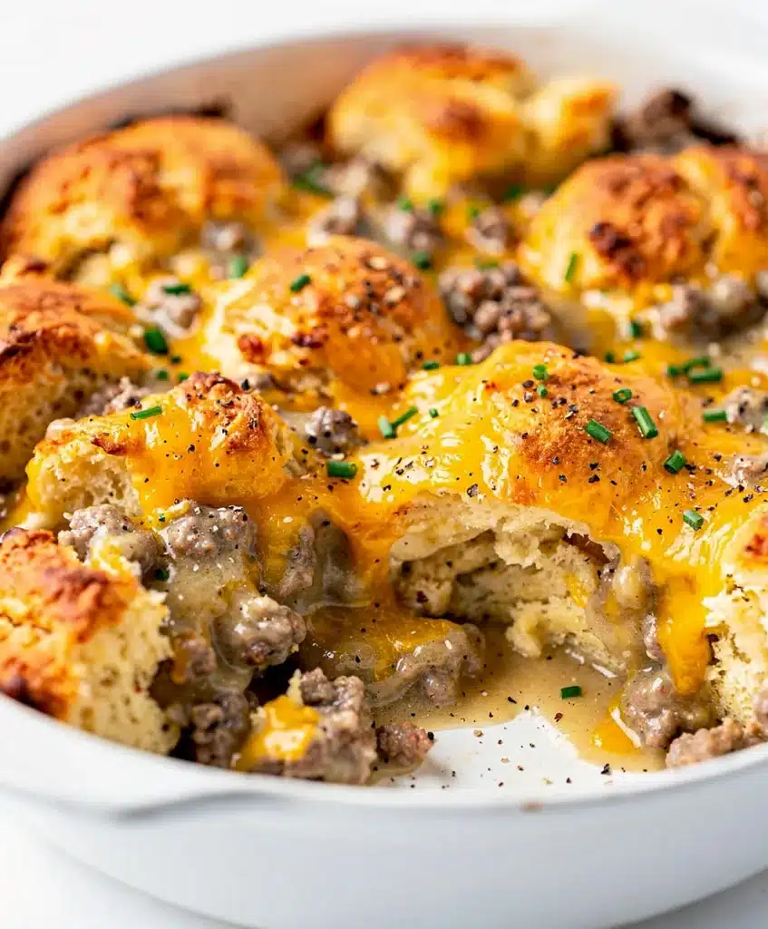 - All-in-One Comfort: No more coordinating multiple pans. The biscuits bake right in the gravy, soaking up all the savory flavor.