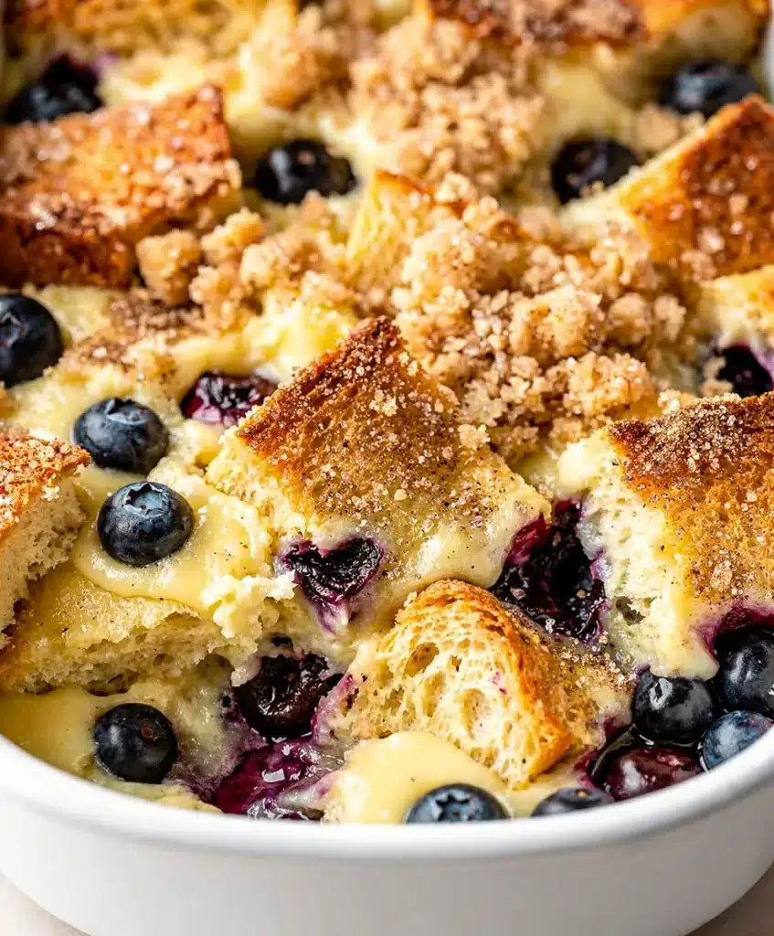 This is a comforting, make-ahead breakfast casserole. Slightly stale bread soaks in a rich custard with blueberries and a buttery crumb topping. It’s perfect for a crowd or a special weekend treat.