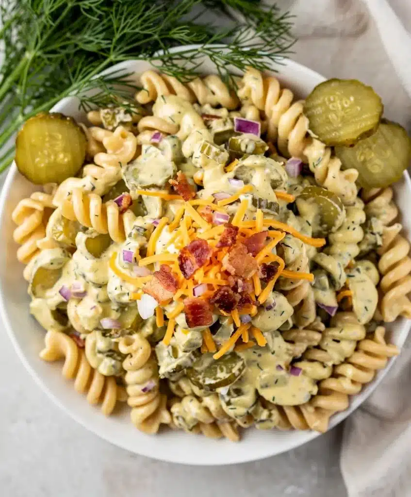 This creamy dill pickle pasta salad is a satisfying side or light main. The pasta provides energy, while the cheese and dressing offer protein and fat to keep you full. Using whole-grain pasta can add fiber, and the pickles provide a bit of probiotic benefit from the fermentation brine.