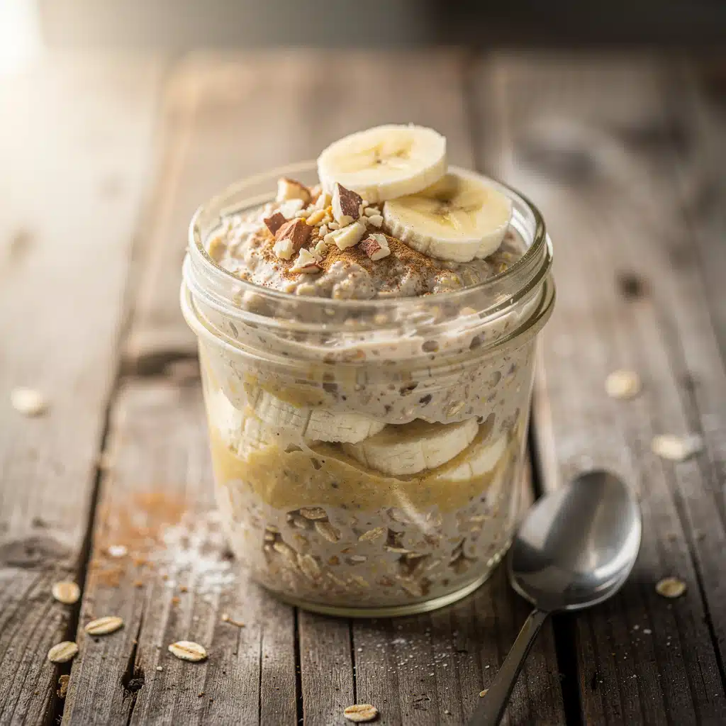 A simple, no-cook breakfast that tastes like homemade banana bread. These overnight oats are creamy, packed with fiber and protein, and perfect for busy mornings. Just mix the ingredients the night before for a ready-to-eat breakfast.