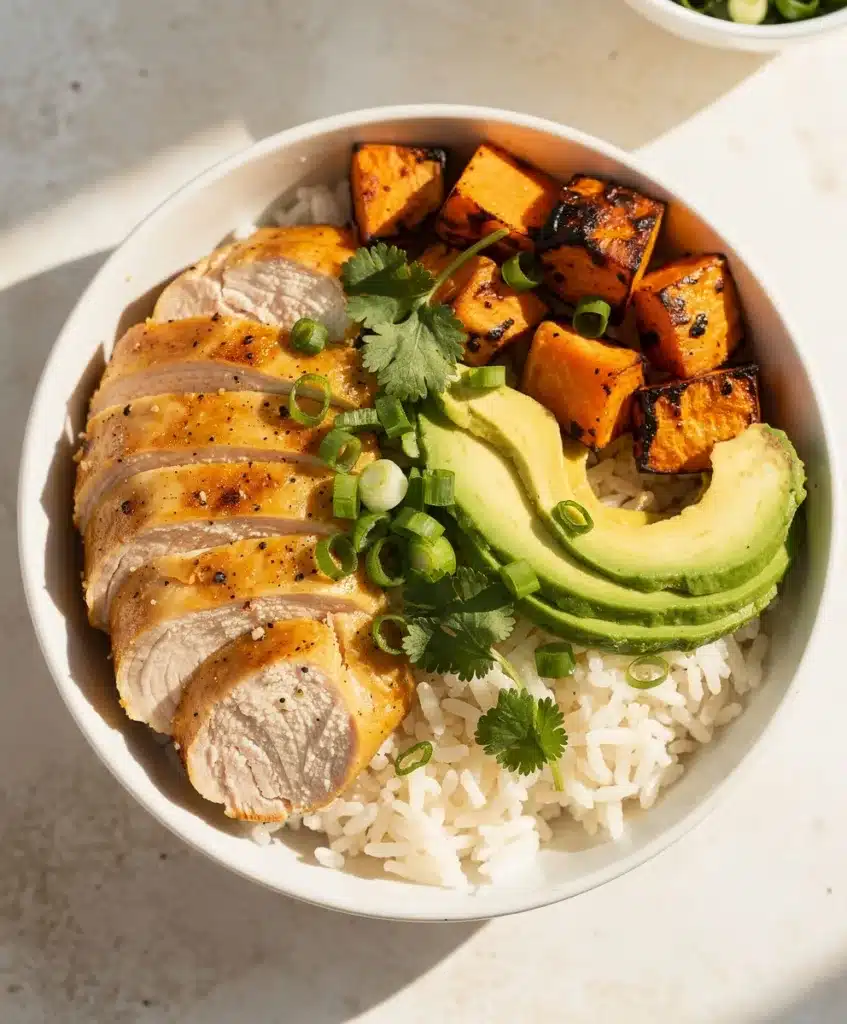 A complete, cozy meal in a single dish featuring juicy marinated chicken, roasted sweet potatoes, and fluffy rice. This nourishing bowl is packed with lean protein, vibrant veggies, and balanced flavors for a deeply satisfying dinner.