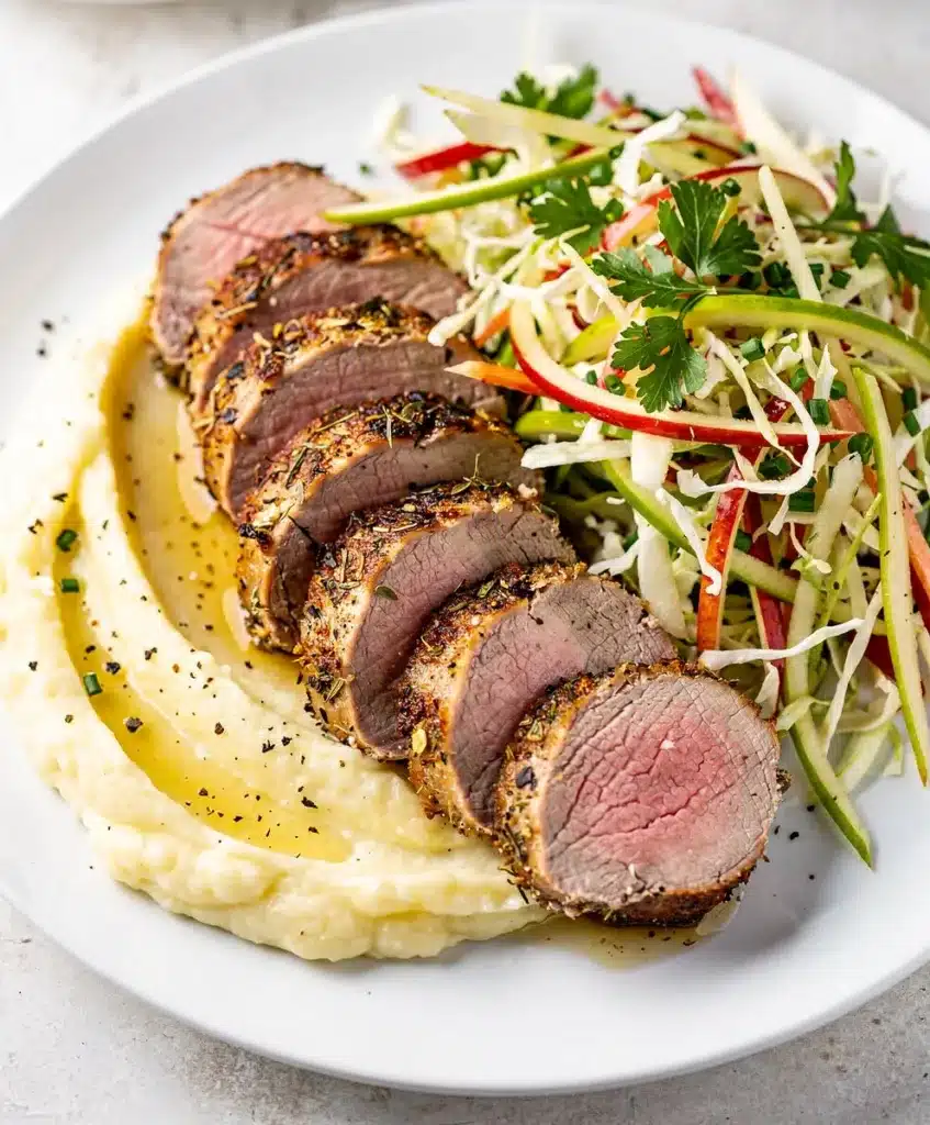 A quick and elegant weeknight meal featuring a juicy pork tenderloin coated in a fragrant paste of fresh herbs, garlic, Dijon, and maple. It’s seared for a flavorful crust and roasted to perfection, ready in about 30 minutes. Serve with mashed potatoes and a simple slaw for a comforting dinner.