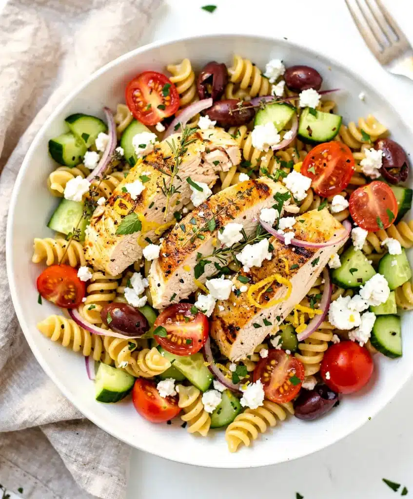 A vibrant, make-ahead salad perfect for summer. It features tender, herb-marinated chicken tossed with pasta, fresh vegetables, and a bright lemon dressing. This dish is a complete, satisfying meal that tastes even better the next day.