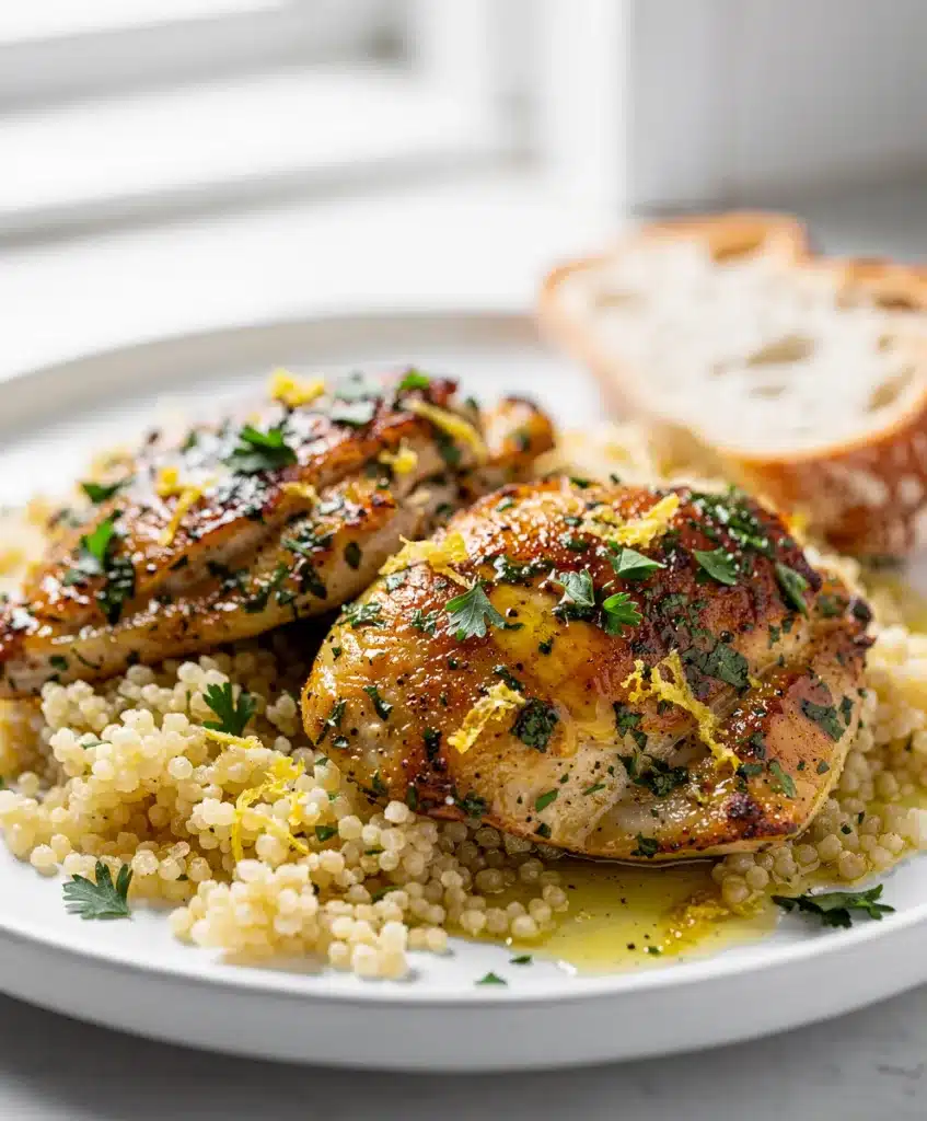 This one-pan wonder is a quick and comforting dinner, ready in 30 minutes. Juicy chicken is seared golden and simmered in a bright, herby lemon pan sauce. It’s simple, flavorful, and perfect served over couscous or with crusty bread.