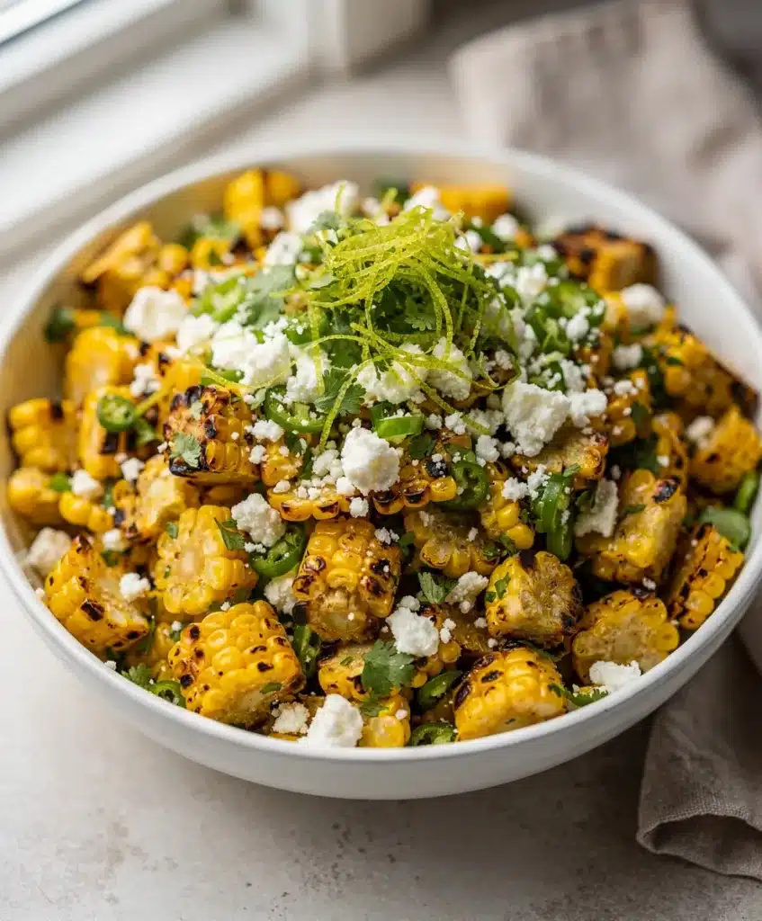 This is a scoopable, shareable version of classic elote. It features smoky grilled corn tossed in a creamy, tangy dressing with cotija cheese, lime, and cilantro. Perfect for potlucks and parties, it avoids sogginess by using cooled corn.