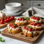 In my kitchen counter was a mess of cherry tomatoes and fresh herbs, but the scent of garlic and roasting fruit promised something special. That’s when I decided to create this simple yet stunning ricotta bruschetta with roasted tomatoes for our impromptu gathering. It was one of those moments where a few simple ingredients, tossed together with intention, transformed into the most memorable appetizer. The creamy ricotta, the sweet burst of roasted tomatoes, the crisp bread—it felt like sunshine on a plate. This ricotta bruschetta with roasted tomatoes has since become my secret weapon for last minute entertaining, busy weeknights, and everything in between. It’s the kind of food that brings people together without demanding hours in the kitchen. Simple ingredients, warm memories.