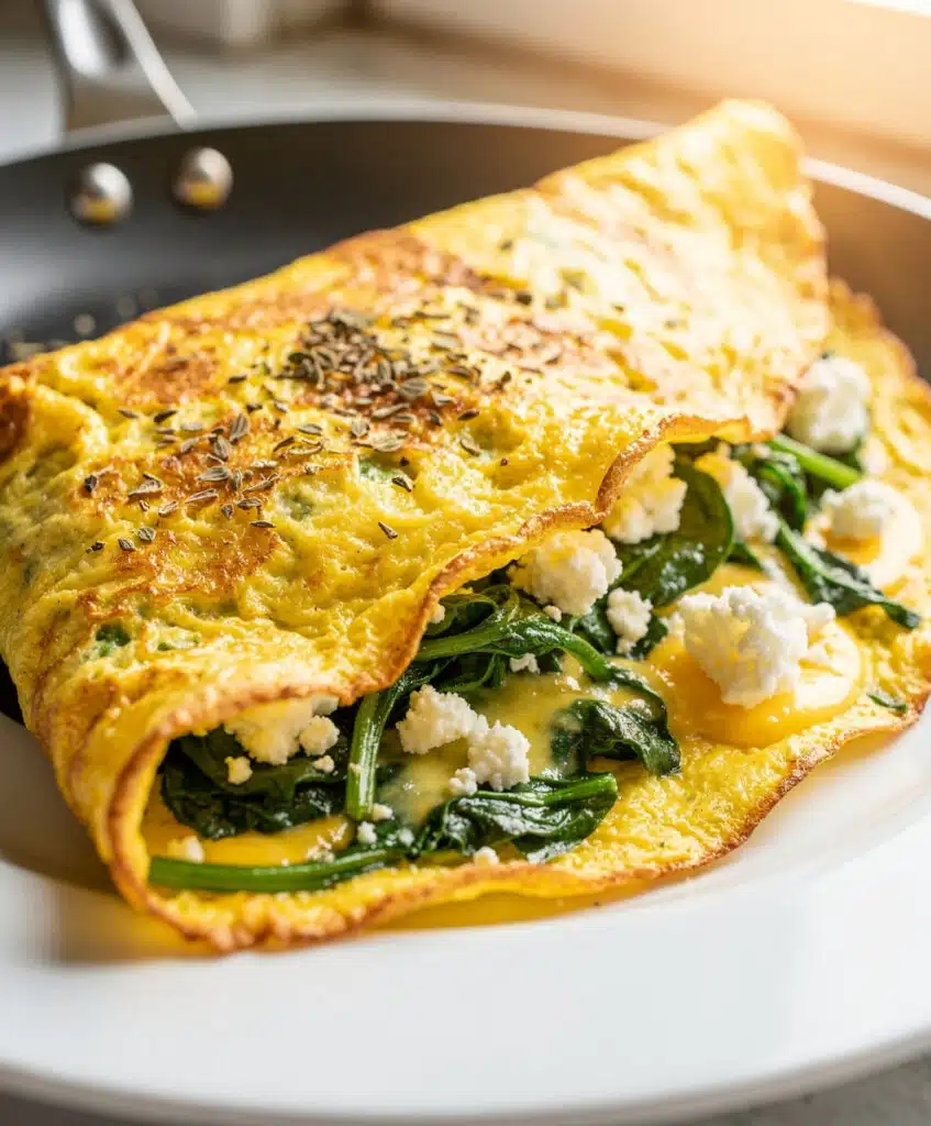 A quick and wholesome Mediterranean-inspired breakfast. This golden, crispy-edged omelet is packed with fresh spinach and briny feta cheese, delivering a protein-packed start in just minutes. It’s a comforting, adaptable meal perfect for any morning.