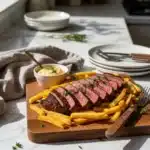 Smart Substitutions: Potatoes: Yukon Gold potatoes will yield a creamier, less crispy fry but are still delicious. Steak: This recipe works beautifully with any high-quality cut you love for a classic Steak And Fries Meal. Dairy-Free: Use a high-quality vegan butter or simply omit the butter and baste with a little extra oil for the steak. Healthier Alternatives: For the Fries: Toss the dried, soaked potato batons with 2 tablespoons of olive oil and bake on a parchment-lined baking sheet at 425°F (220°C) for 25-35 minutes, flipping halfway, until golden and crisp. An air fryer also works wonderfully for a lighter fry. For the Steak: Trim any visible fat from the steak before cooking. Instead of basting with butter, use a spritz of olive oil and fresh herbs in the pan. Sauce Swap: Skip the compound butter and serve with a fresh, zesty chimichurri or a dollop of whole-grain mustard. Storing Tips: Leftover Fries: Store cooled fries in an airtight container in the refrigerator for up to 3 days. Re-crisp them in a 400°F (200°C) oven or air fryer for a few minutes. They will not be as perfect as fresh, but they are still tasty. Leftover Steak: Store sliced or whole steak in an airtight container in the fridge for up to 3 days. Gently reheat in a low oven or enjoy cold in salads or sandwiches.