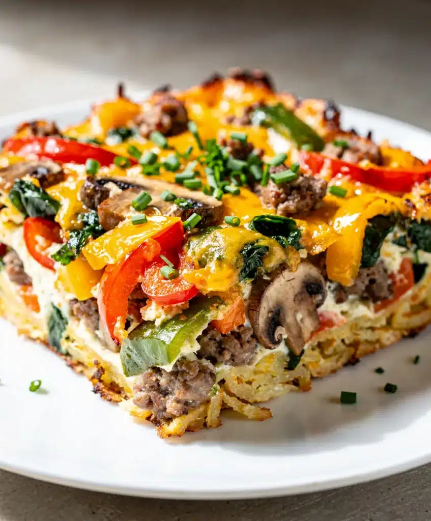 This hearty, make-ahead breakfast casserole is the perfect solution for busy mornings or feeding a crowd. Packed with eggs, sausage, colorful vegetables, and cheese over a hash brown crust, it bakes up golden and satisfying. Assemble it the night before for a stress-free, delicious start to the day.